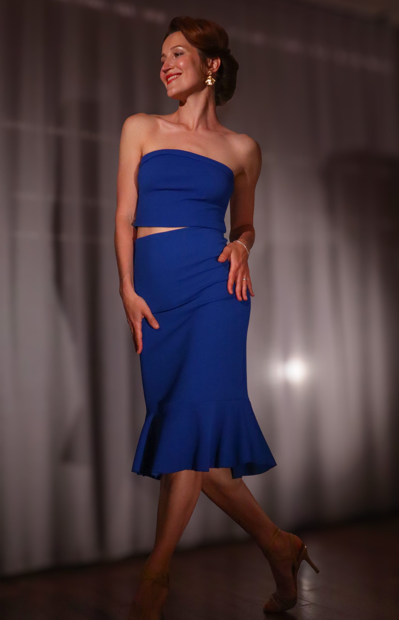 Falda tubo con terminación de volados en el dobladillo. Tajo pequeño detrás, en piqué elastizado
